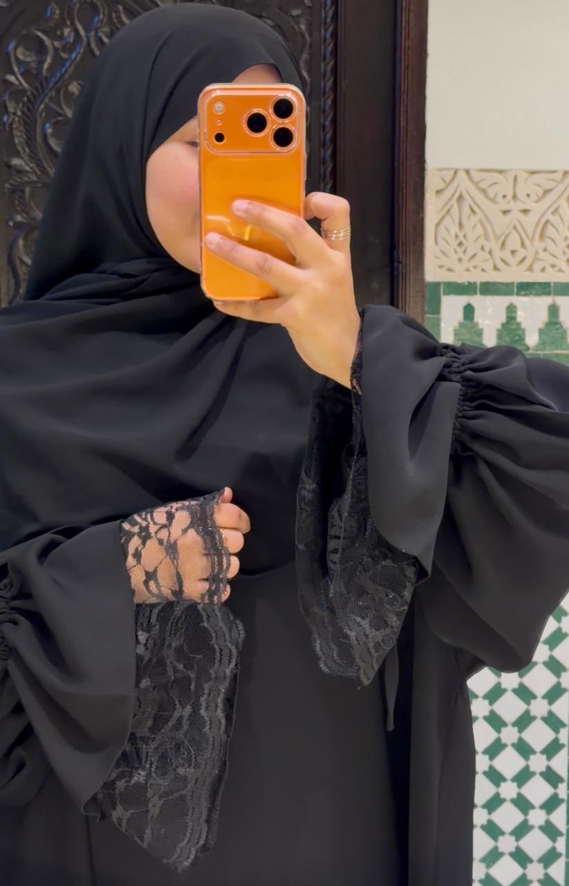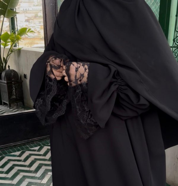 Ensuite, voici la abaya NAJMA en version fermée. Une pièce vraiment incroyable, qui rappelle l’esprit de notre design MARTA pour celles qui le connaissent. On y retrouve des fines cordelettes au niveau des manches, et cette fois-ci, on a ajouté une touche de dentelle délicate pour un rendu encore plus festif, parfait pour vos évènements et invitations. Une pièce très chic, pleine de finesse.